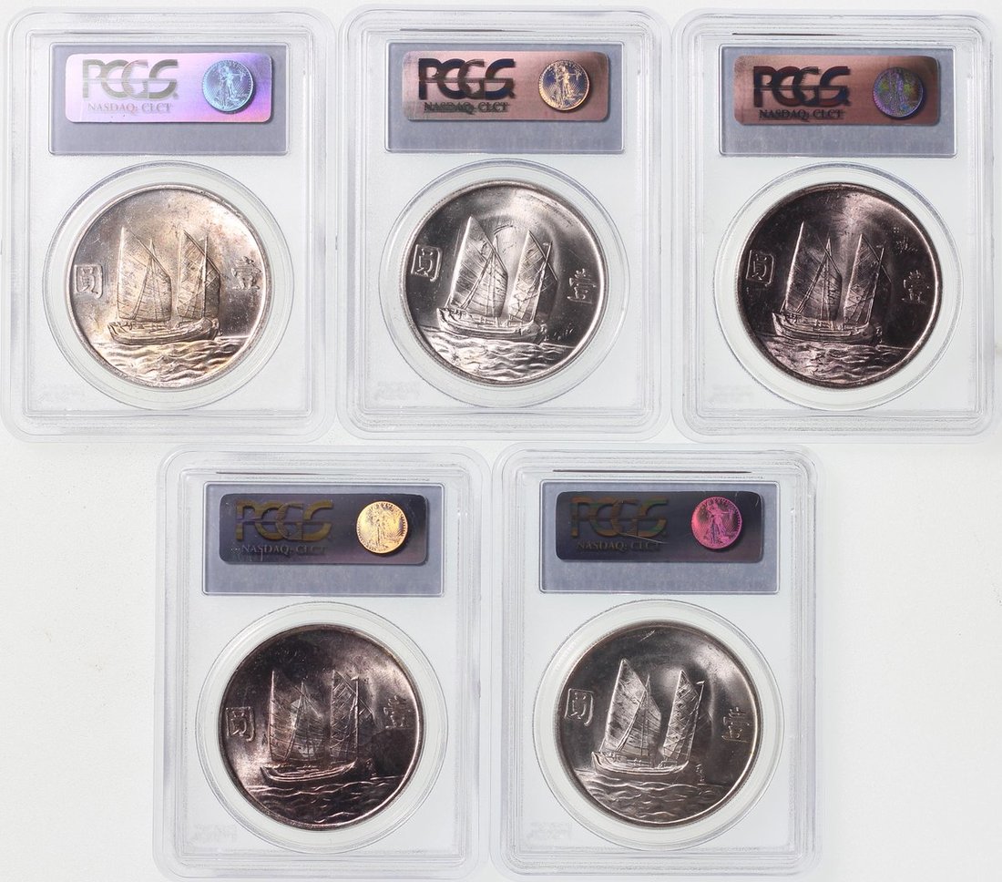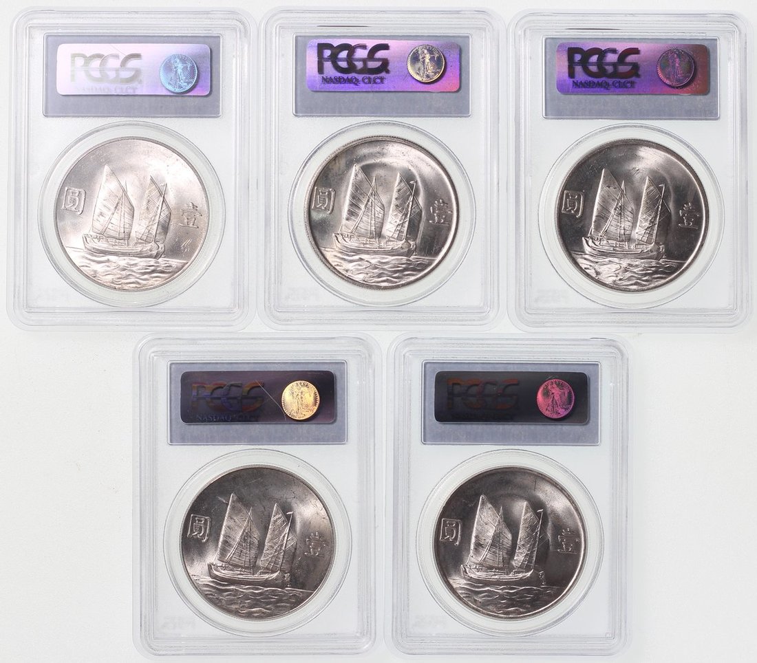 民國二十三年孫中山像帆船壹圓10枚一組,均評PCGS MS63,舊評級標簽,帶原光