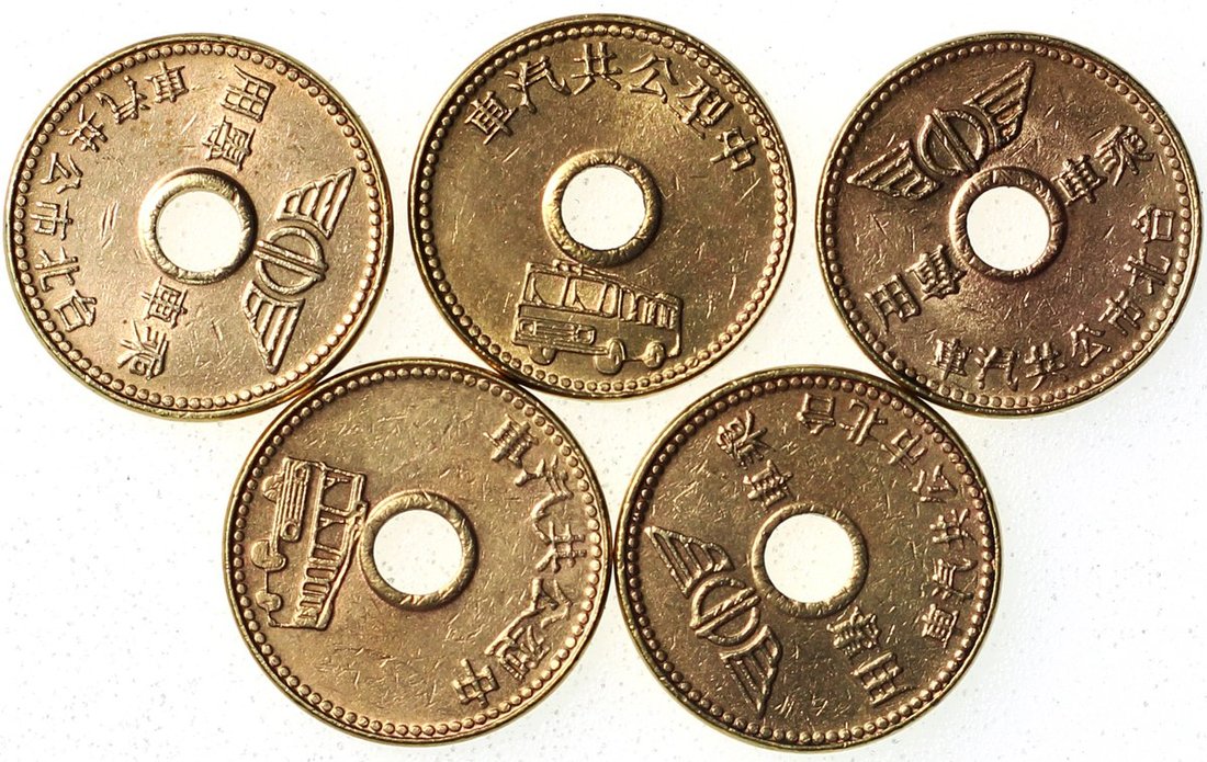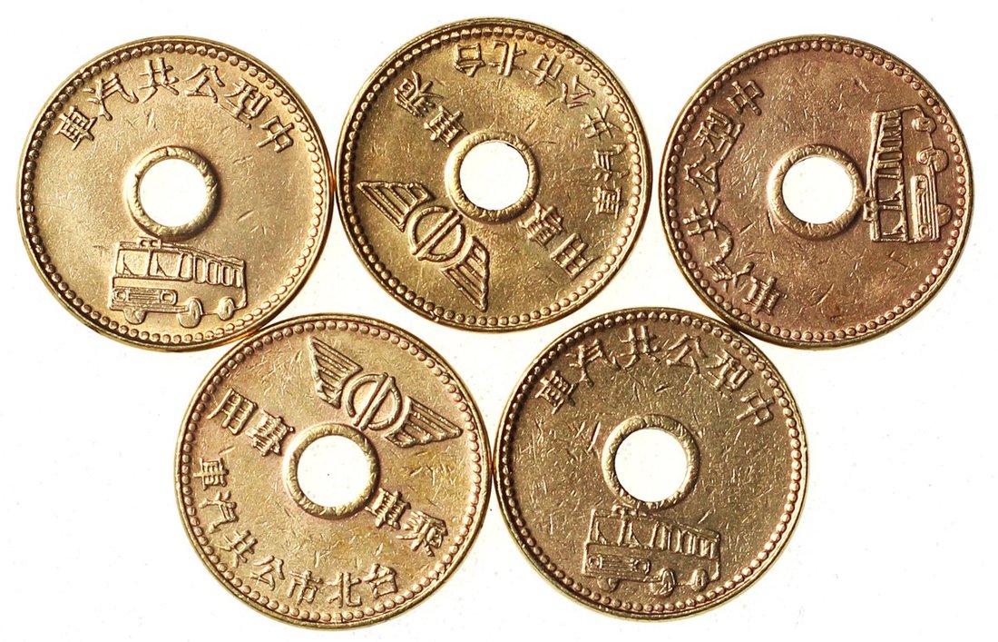 Taiwan, group of 5x bus tokens, circa 1970's, for medium sized buses,