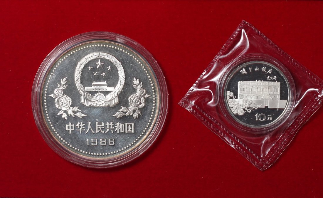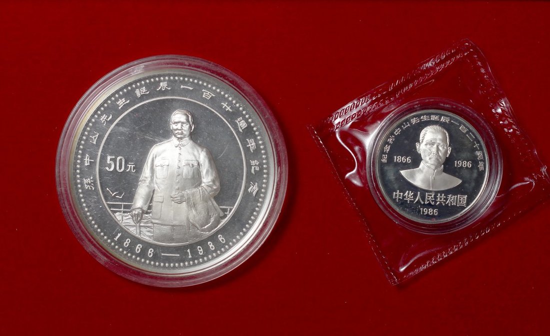 1986年中華人民共和國10元及50元精鑄銀幣,孫中山誕辰一百二十周年,分別含1盎司及5盎司銀,附原盒及證書,UNC品相