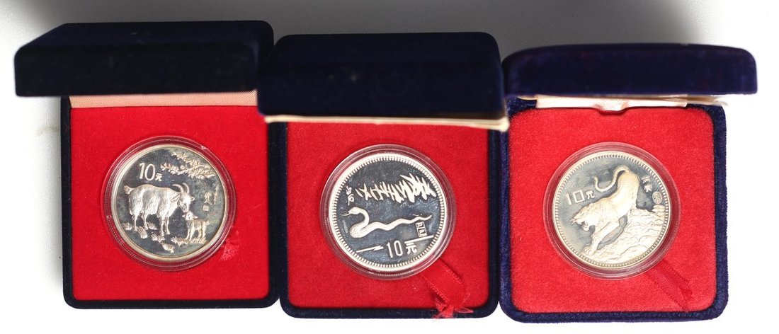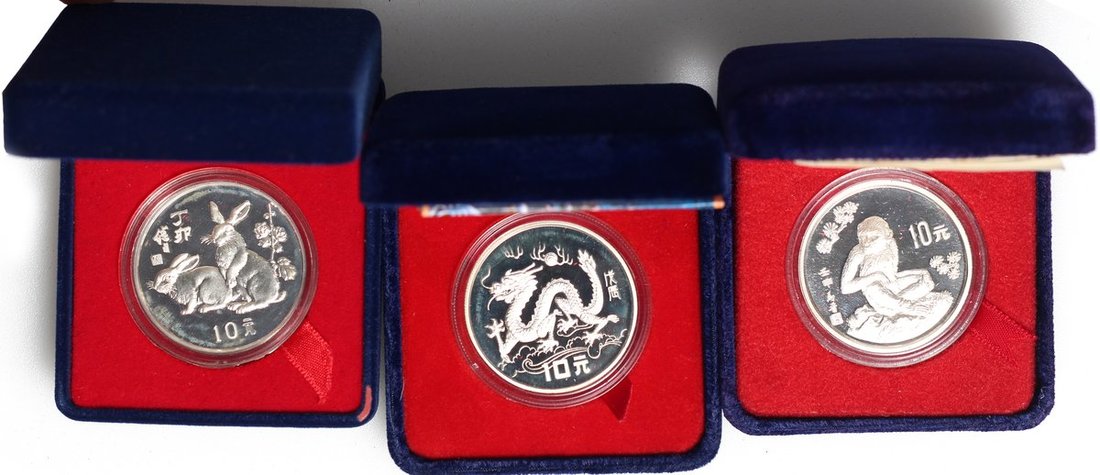People's Republic of China, a group of 6x silver 10 yuan, Lunar series, consisting of 1986, Year of Tiger, 1987, Year of Rabbit, 1988, Year of Dragon, 1989, Year of Snake, 1991, Year of Goat and 1992, Year of Monkey, mostly frosted, the 1991 without certificate, the rest with original certificates and boxes.(6)