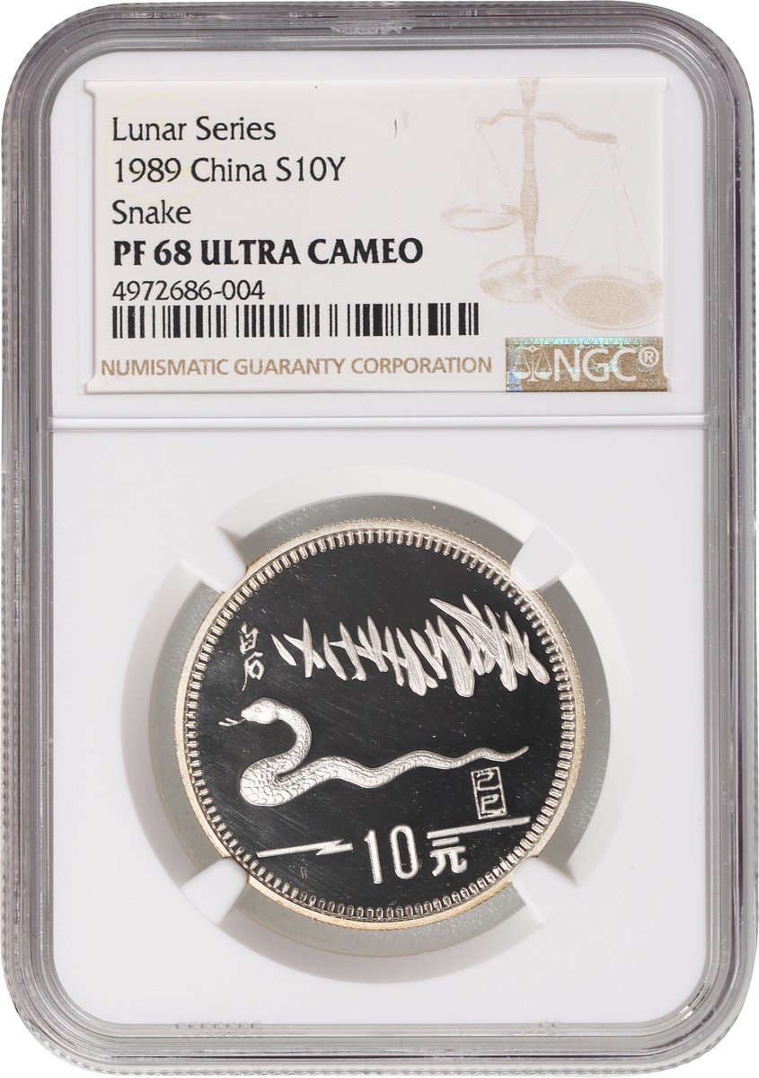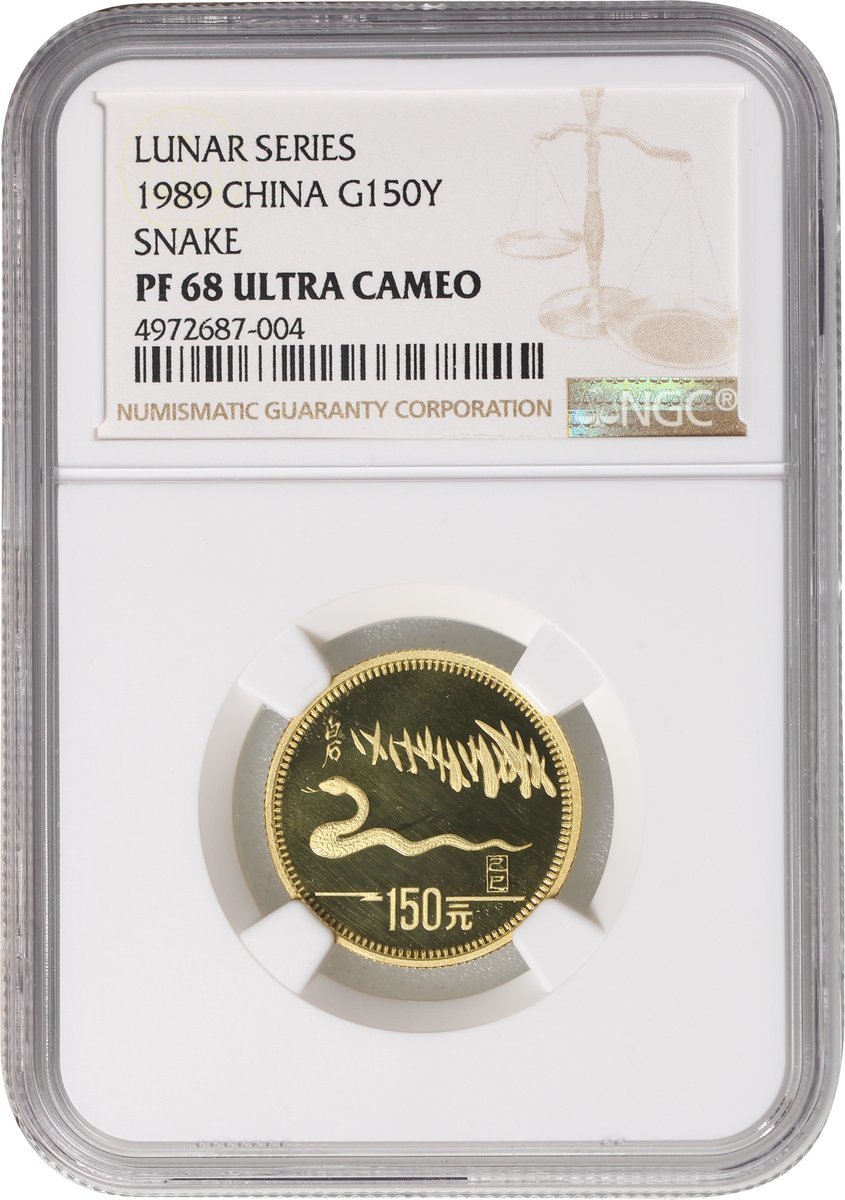 1989年中華人民共和國蛇年10元紀念銀幣及150元紀念金幣一對,均NGC PF68 Ultra Cameo
