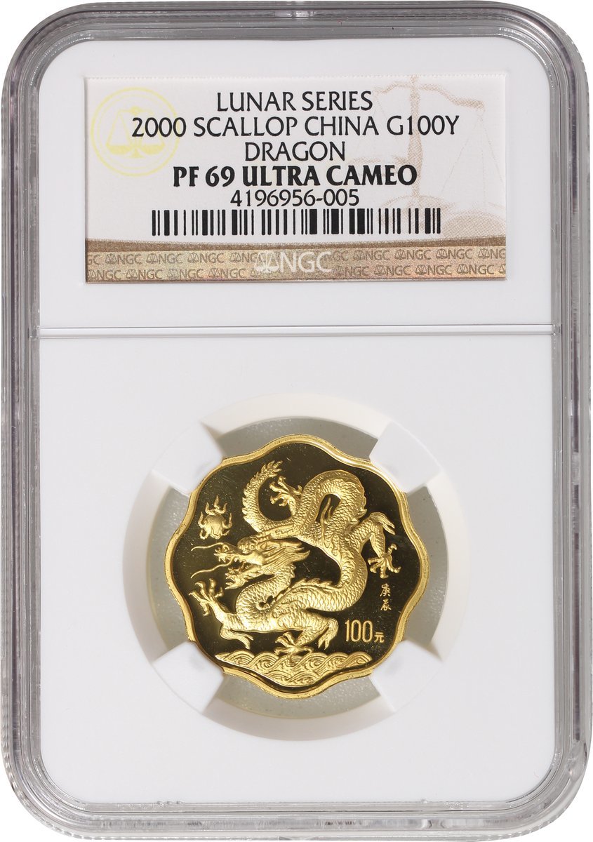 People's Republic of China, gold 100 yuan, 2000, Year of Dragon, scallop shaped, 1/2 oz gold, NGC PF 69 Ultra Cameo.