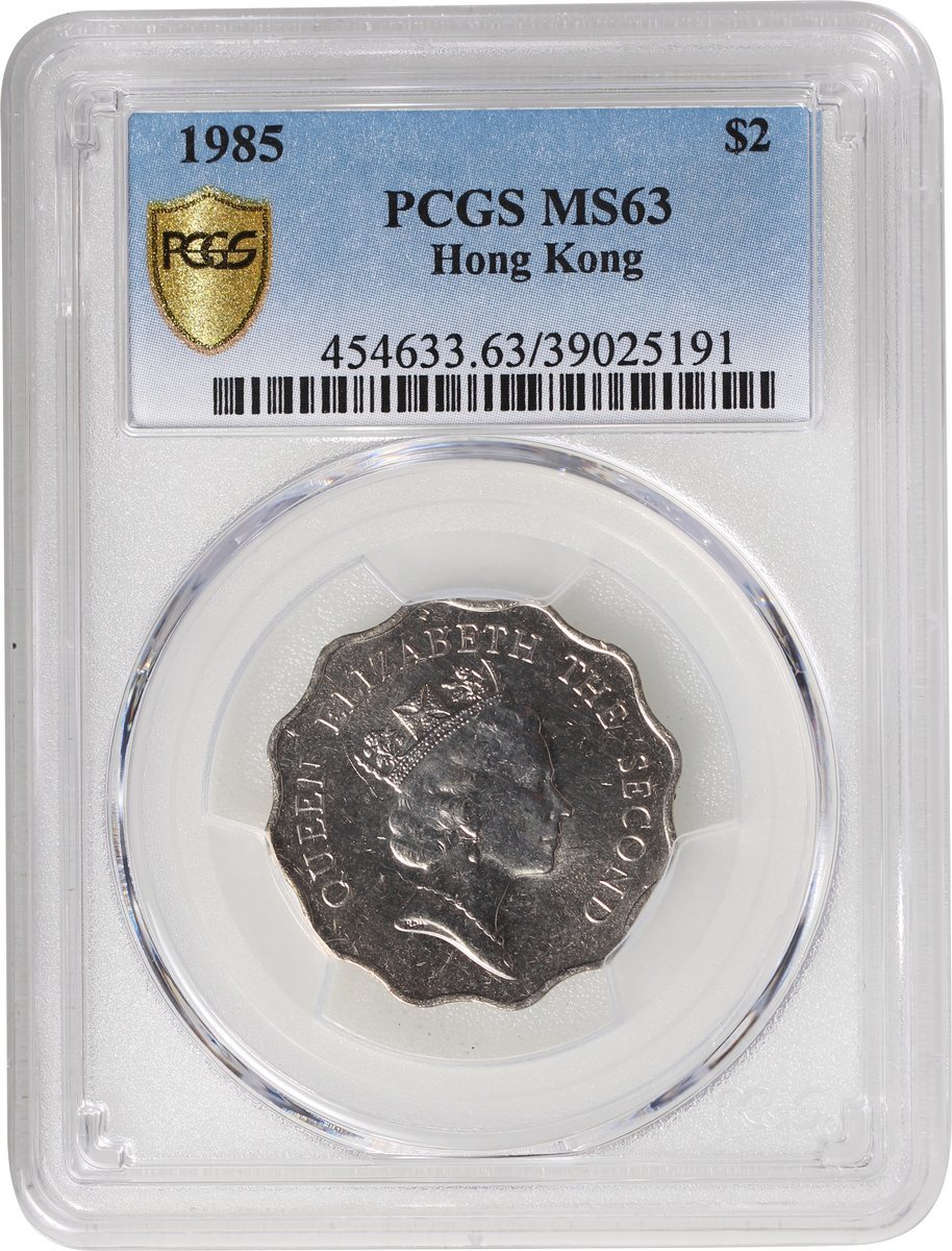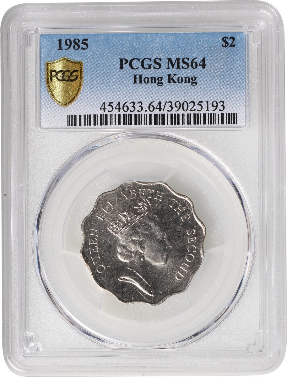 Hong Kong, a pair of copper nickel $2, 1985, graded PCGS MS63 and MS64 (2)
