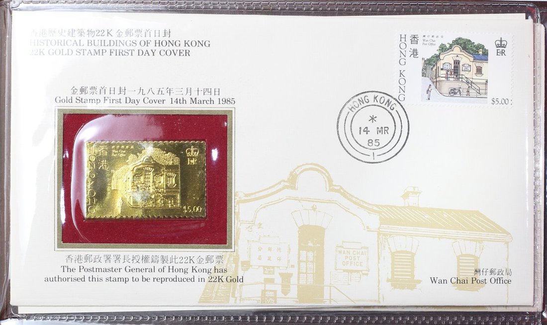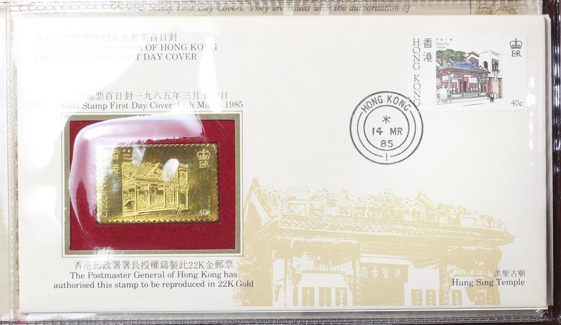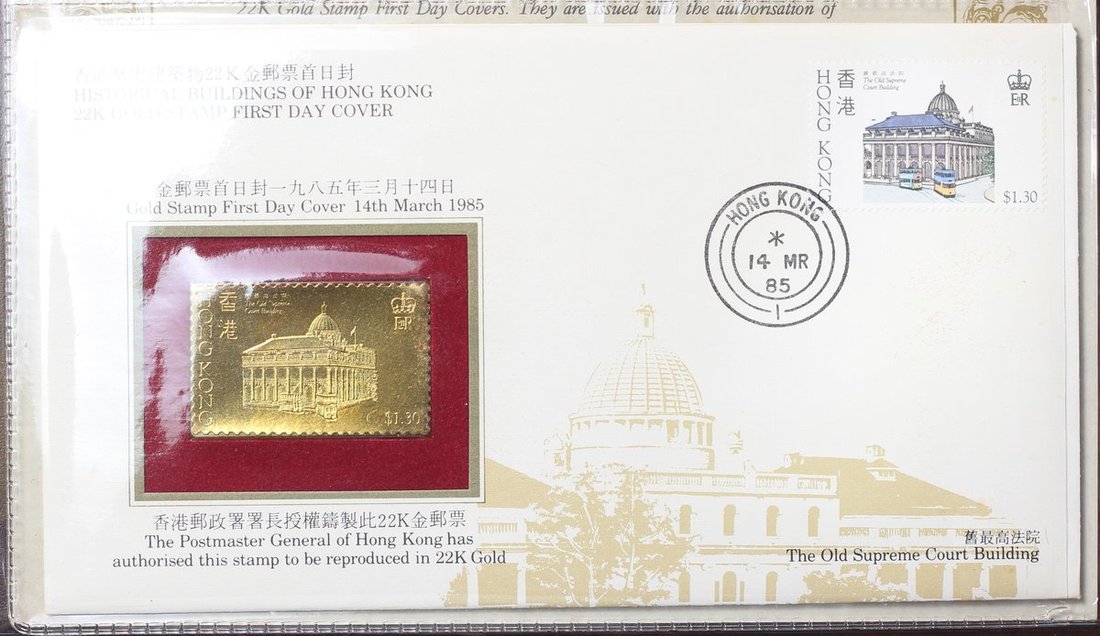 Hong Kong, Historical Buildings of Hong Kong 22K Gold Stamp First Day Covers, 14.3.1985, consists of 4 gold emblem stamps,
