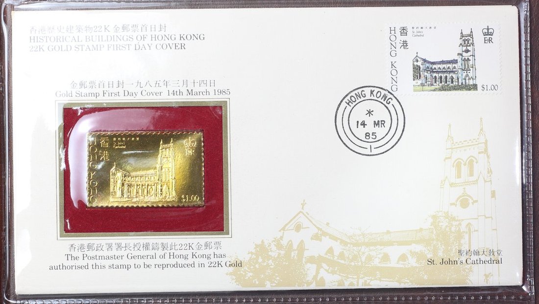 1985年香港歷史建築22K黃金首日封連4枚金郵票,證書編號3397,發行量僅8000套