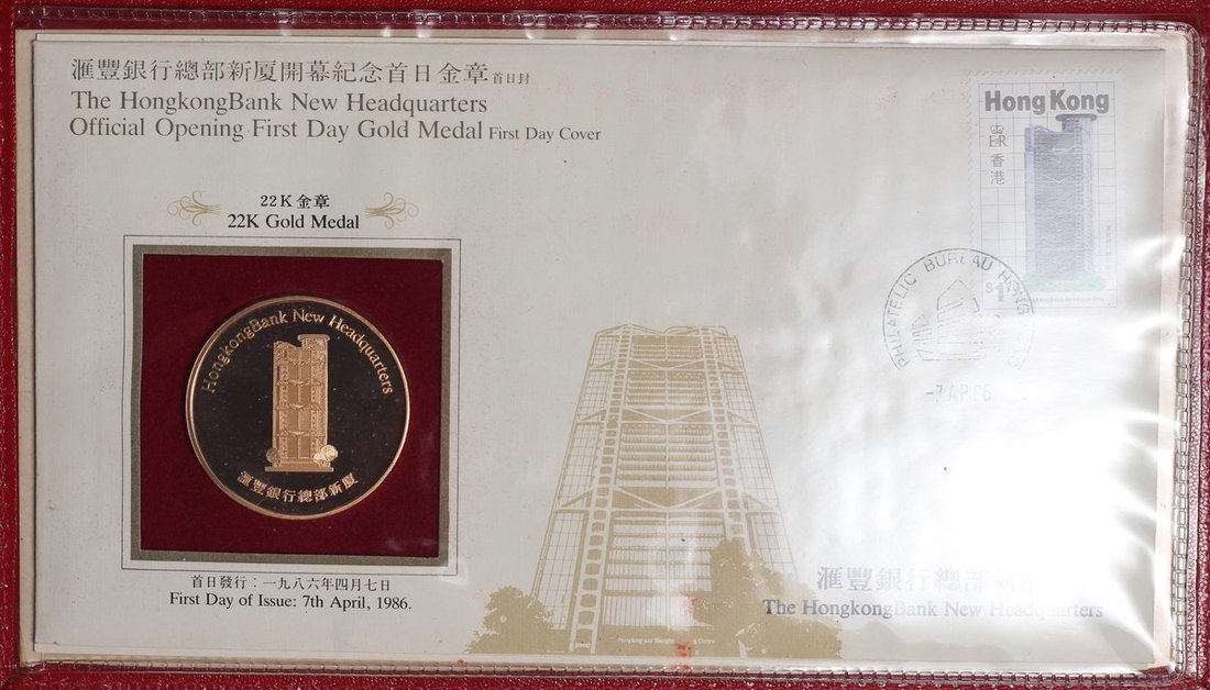 Hong Kong, a gold medal commemorating the new HSBC Building, 1986, first day cover with the gold medal, 1.356 oz AGW, house in red leatherette folder,