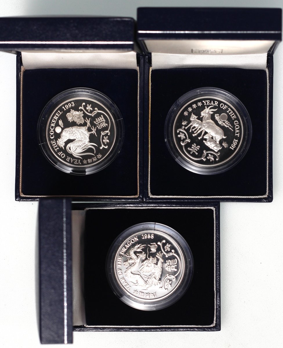 Hong Kong, lot of 3 silver medallions struck by the Royal Mint, Year of the Dragon, (1988), Year of the Goat (1991) and Year of the Rooster (1993),
