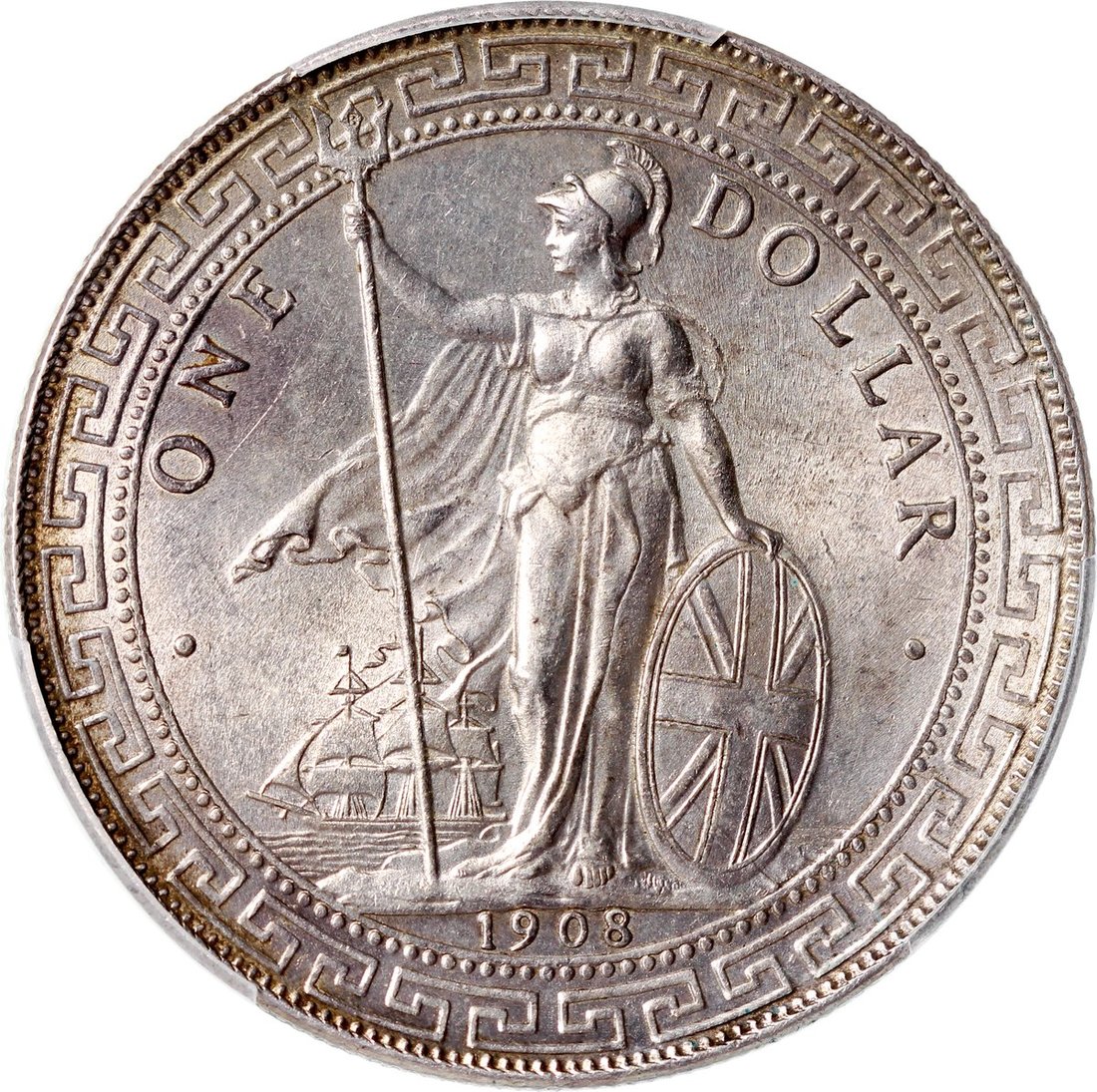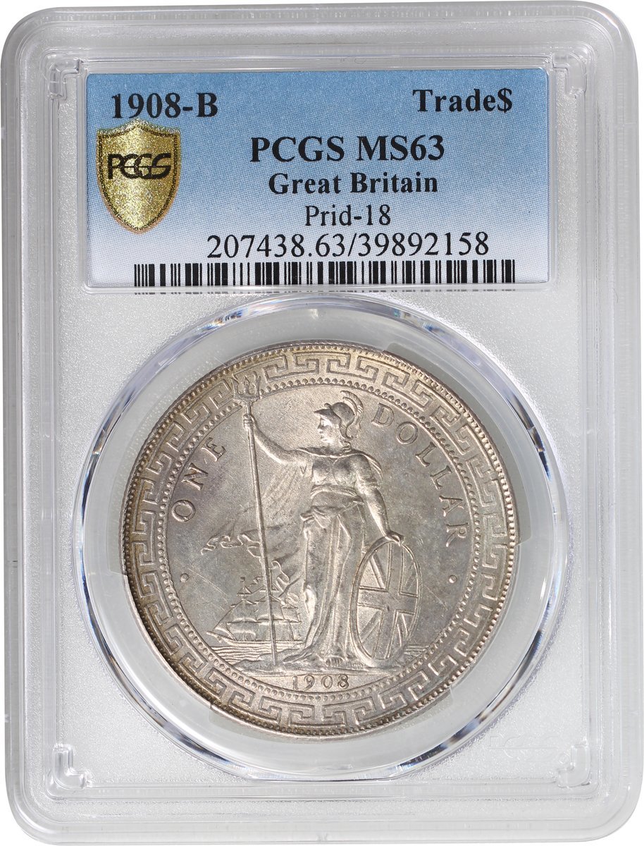1908-B英國貿易銀元,PCGS MS63,淺蜜糖色包漿