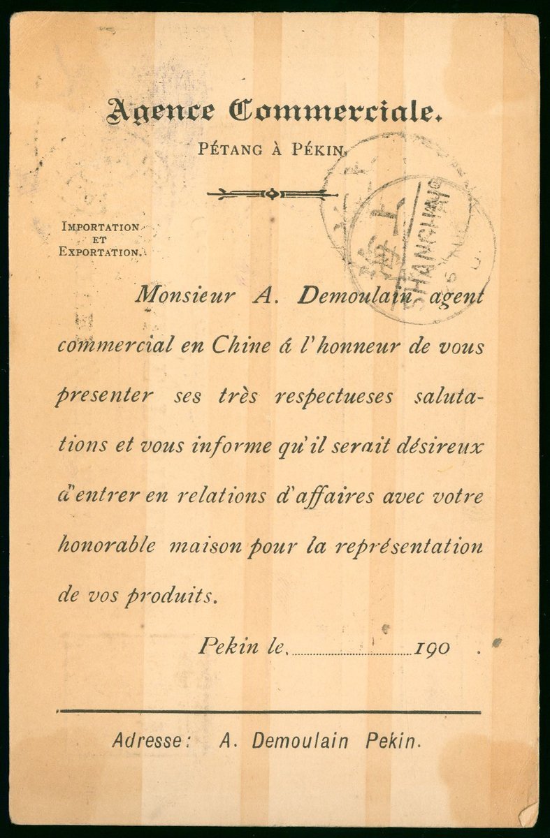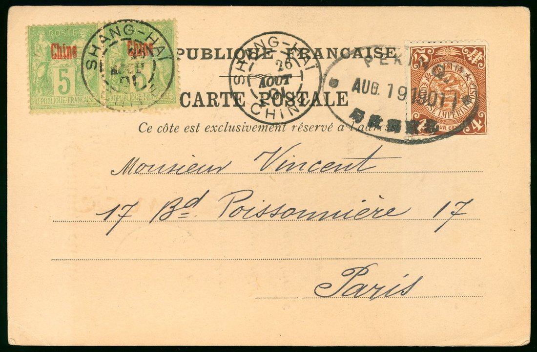 1901年北京寄巴黎明信片1件,貼倫敦版蟠龍棕4分1枚,法國客郵5分2枚,蟠龍銷北京郵政局8月19日英漢橢圓戳,經上海中轉,有上海25日小圓戳,法國客郵銷上海26日法國客郵局日戳,保存完好