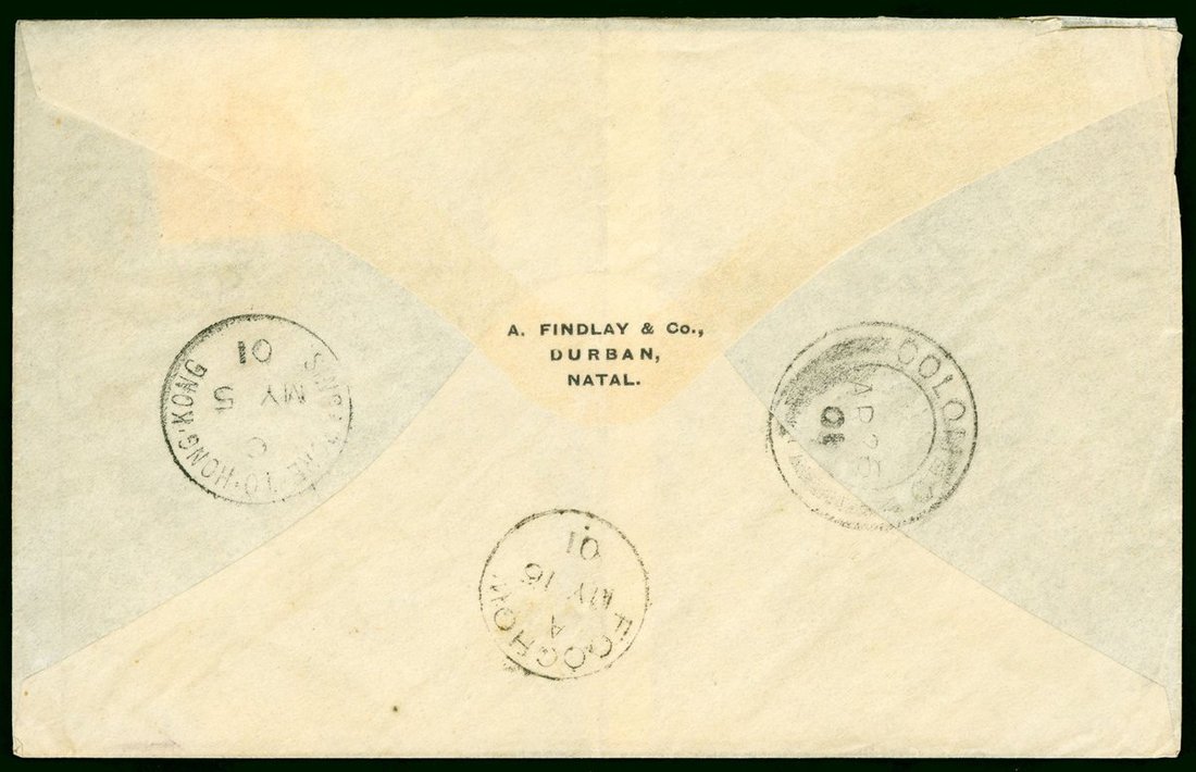 1901 (4 Apr.) an incoming envelope to Foochow bearing Natal 2½d. tied by Durban c.d.s., sent via Colombo (26.4) and bears the marine sorter Singapore-To-Hong Kong (5.5) and Foochow (16.5) arrival c.d.s.