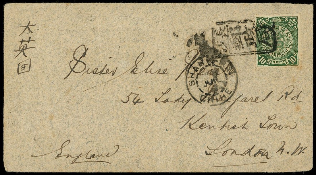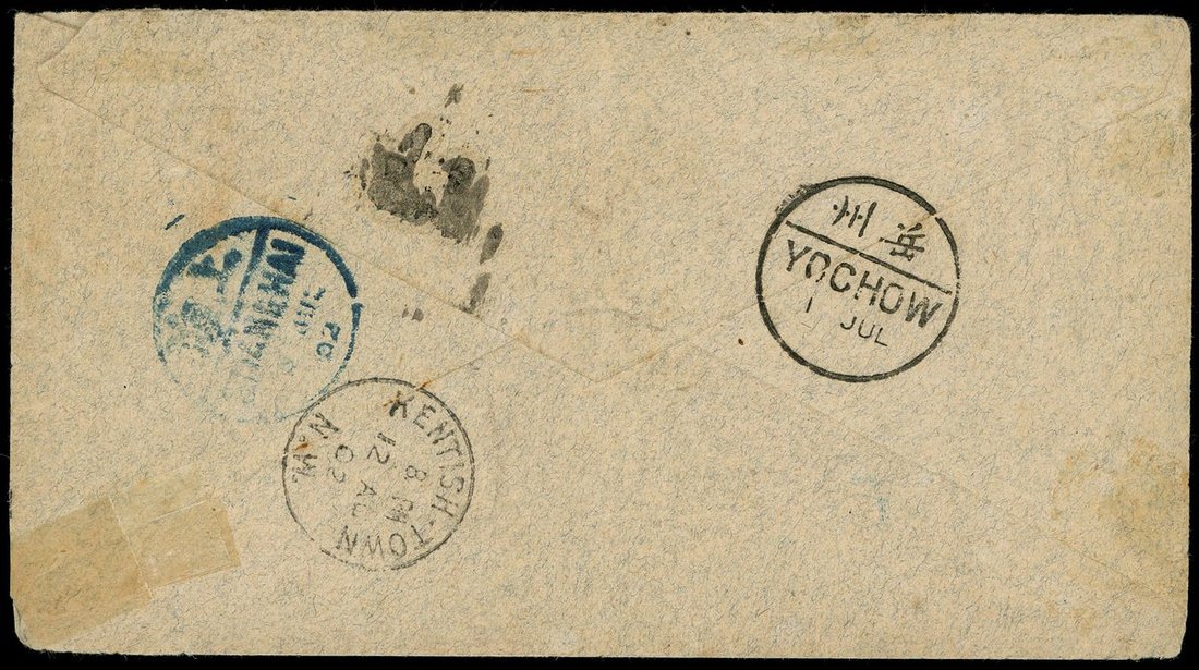 1902 (1 Jul) An envelope to England bearing 10c. tied by Changsha tombstone cancellation, on reserve showing Yochow(1.7) and Shanghai(8.7) transit c.d.s, Kentish-Town(12.8) arrival c.d.s.
