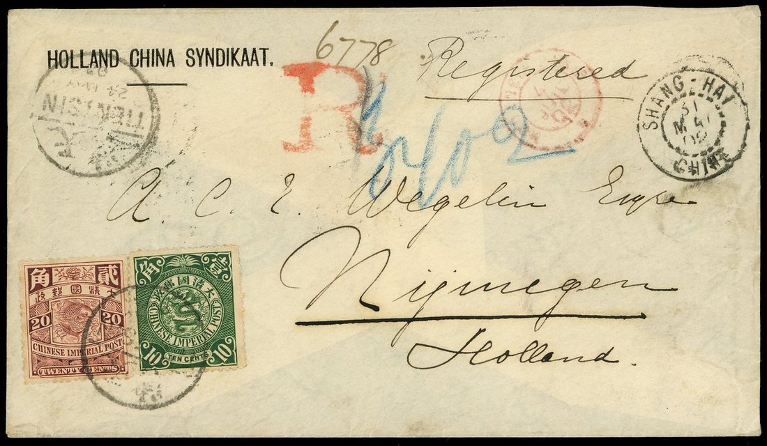 1902 (24 May) A registered cover to Holland bearing 10c. and 20c. tied by Tientsin bilingual c.d.s., showing ' R ' registered marking, via Shanghai(31.5) and Holland(5.7) arrival c.d.s.