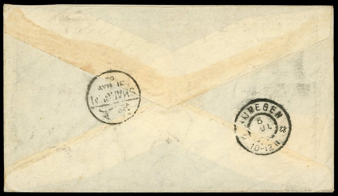 1902年天津寄荷蘭掛號封1件,貼倫敦版蟠龍10分20分各一枚,銷天津5月24日小圓戳,另蓋天津紅色R掛號戳,經上海中轉,有上海5月31日小圓戳,上海法國客郵局31日戳,法國7月4日中轉戳,及荷蘭7月6日到達戳,郵路清晰,保存完好