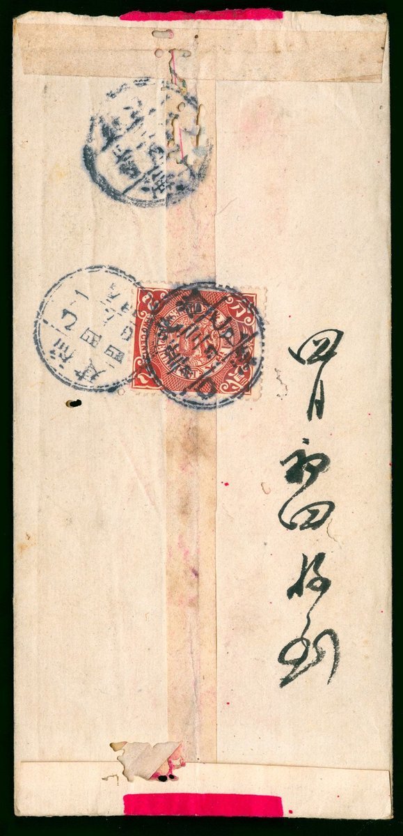 1905年3月23日(農曆乙巳年) 漢口寄廈門帶原函紅條封, 背貼蟠龍貳分票, 銷漢口干支日戳, 3月27日上海中轉,於4月4日到達福建廈門.