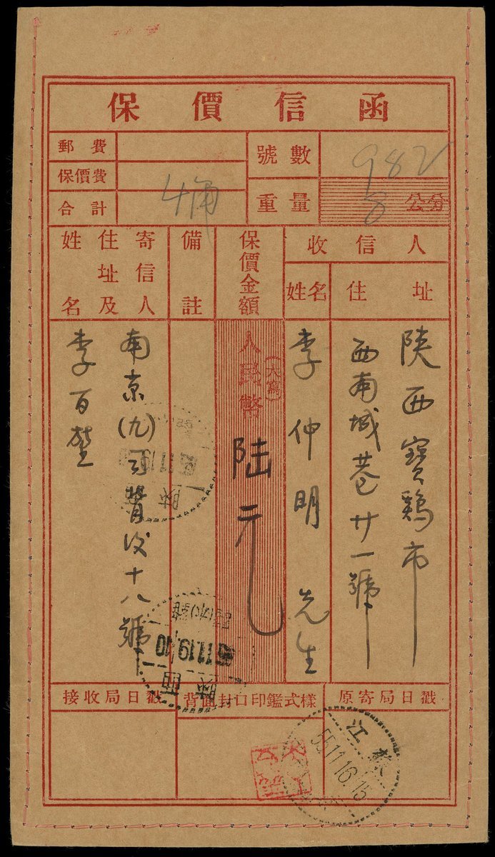 1955年南京寄寶雞保價信函專用封1件,貼普7.800元1枚,特13四枚不同,總郵資合計40分,銷江蘇南京11月16日戳,有陝西寶雞19日到達戳,郵戳清晰,保存完好,新舊幣混貼之保價信函非常少見