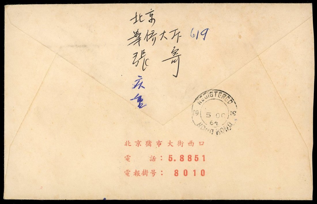 1964 (30 Sep) A registered air mail envelope to Hong Kong bearing S54i Children imperf. issue 4f.(2), 8f.(3) and 10f. tied by Peking c.d.s., on reserve with Hong Kong(5.10) arrival c.d.s., very rare postal usage.