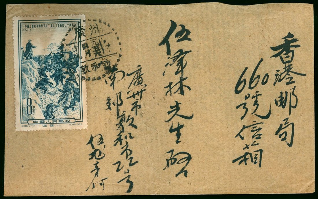 1955-57年內地寄香港實寄封5件,分別貼普7.1600元,特13,紀36等郵票,銷廣州敦和市,山東青島,上海,天津等郵戳,其中3件為1600元國內航空郵資,整體郵戳清晰,保存完好