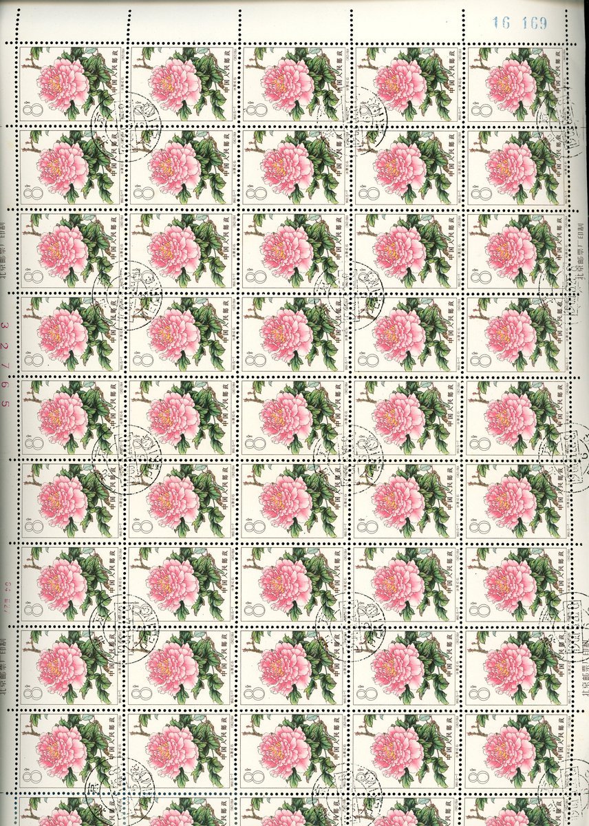 1964年特61牡丹蓋銷票約近百枚,其中含8分50枚全張1件,整體票面顏色鮮豔,原膠,上中品,請預覽