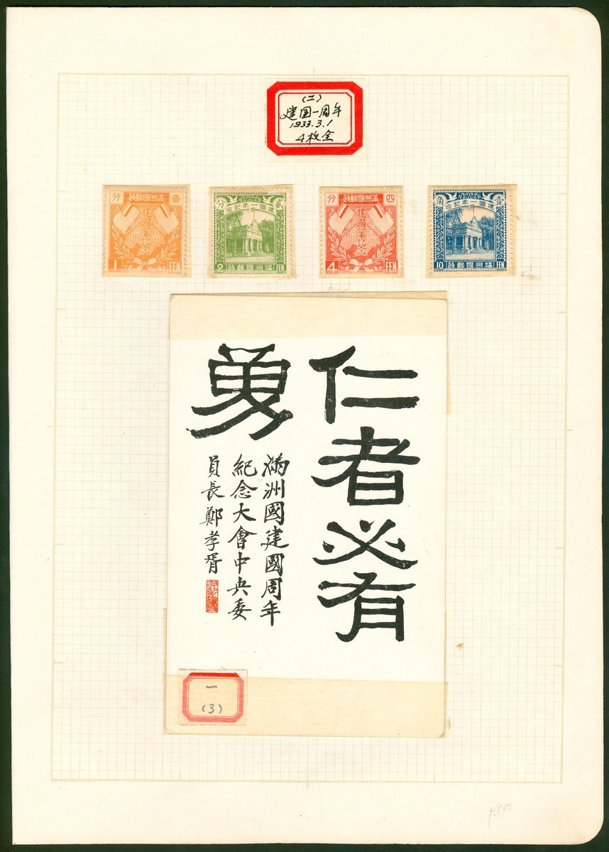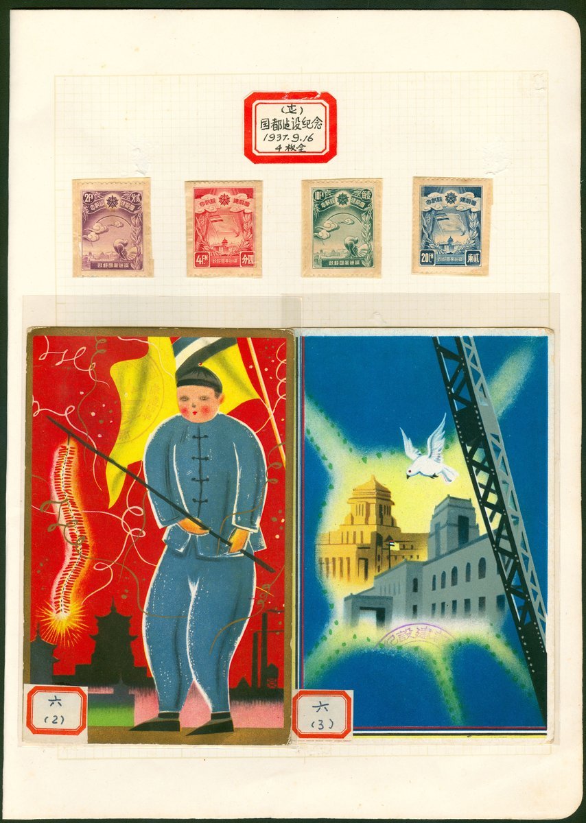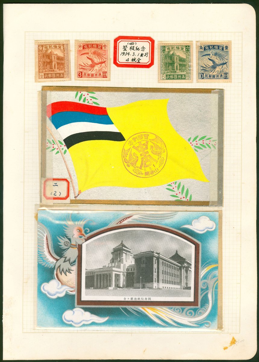 1933-37 four sets of Commemorative stamps; including 1933 1st Anniversary Issue, 1934 Enthronement of Emperor Issue, 1935 First Visit of Emperor to Japan Issue and 1937 Completion of Capital Hsingking Issue. Also six Commemorative postcard.