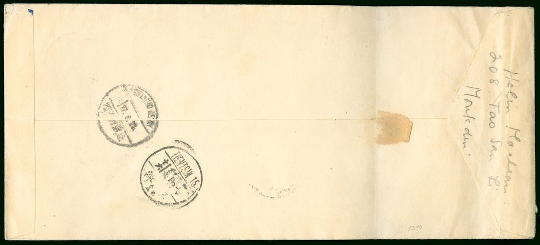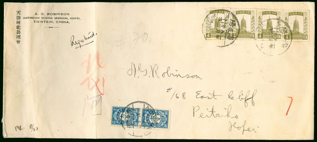 1932 (22 Aug.) a postage due registered cover to Peitaiho bearing 4c. strip of four tied by Moukden 'First Year' c.d.s., via Tientsin (26.8) and bearing postage due 10c. pair tied by Peitaiho Beach c.d.s.