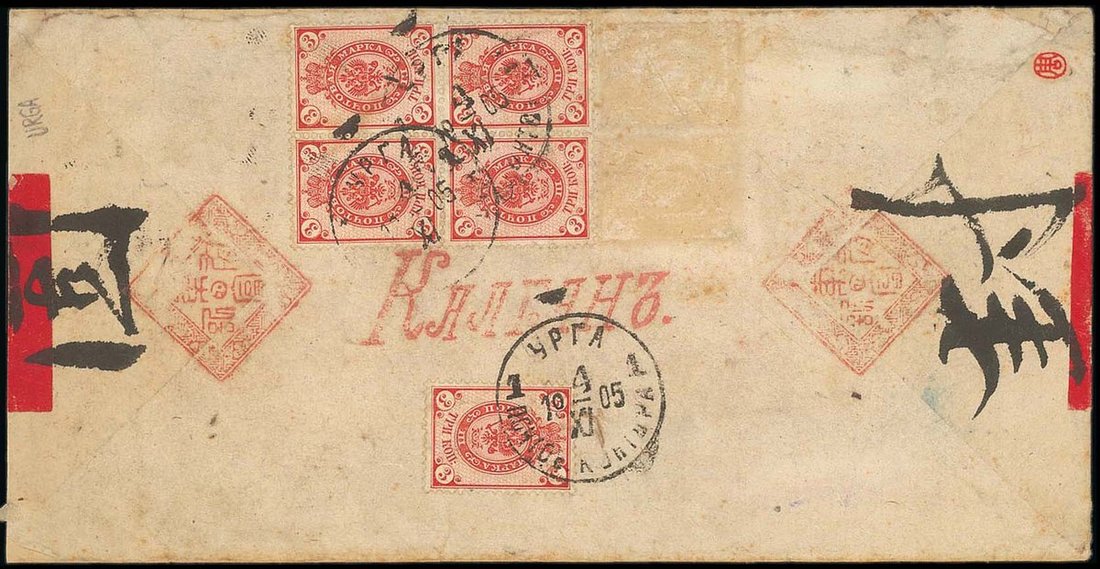 Russian Post Office: 1905 (4 Nov,) red band envelop to Kalgan bearing, on the reverse, Russian Arms 3k. red (5) tied by Urga type III c.d.s; two other adhesives are missing, though there is no tying postmark. Photo