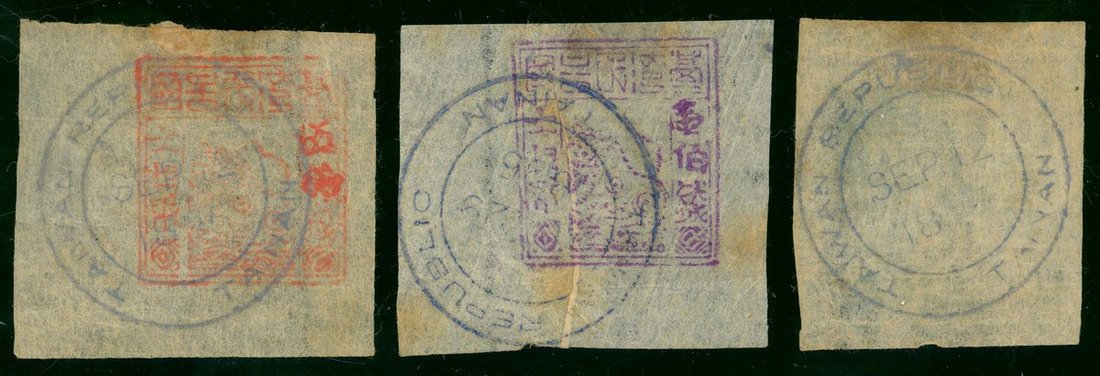 1895 Black Flag Republic 30 cash to 100 cash set of three, cancelled by Taiwan Republic c.d.s. The color of 30 Cash stamp is faded.