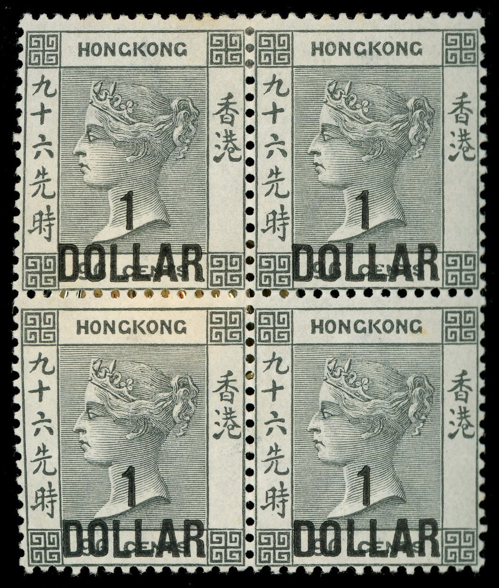$1 on 96c. grey-black in a block of four, large part original gum. Fresh and fine. A rare block, possibly only three or four remaining. S.G. 53a