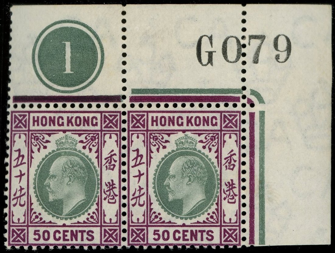 Requisition "G": 50c. grey-green and deep magenta in a top right corner pair with sheet number "G079", lightly mounted in the margin only. 200 sheets issued