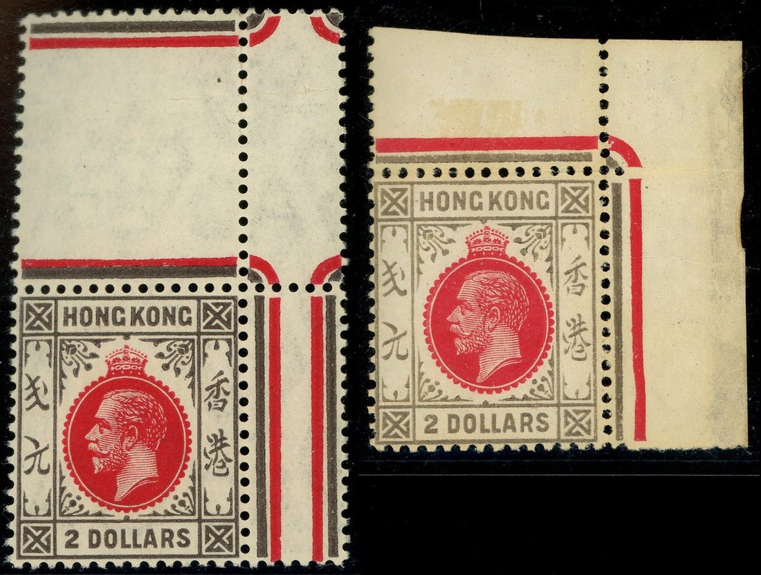 $2 carmine-red and grey-black in a top right interpanneau corner margins, unmounted mint; light gum ageing. Also 1921-37 $2 carmine-red and grey in a top right corner margin, unmounted mint; some light gum ageing. S.G. 113, 130, £340