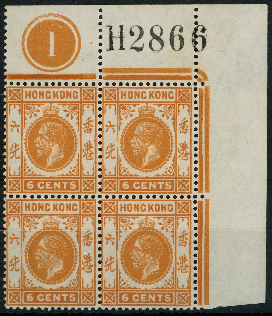 6c. deep yellow-orange in a corner plate block of four, sheet number "H2866", tiny adherence in margin, otherwise unmounted mint