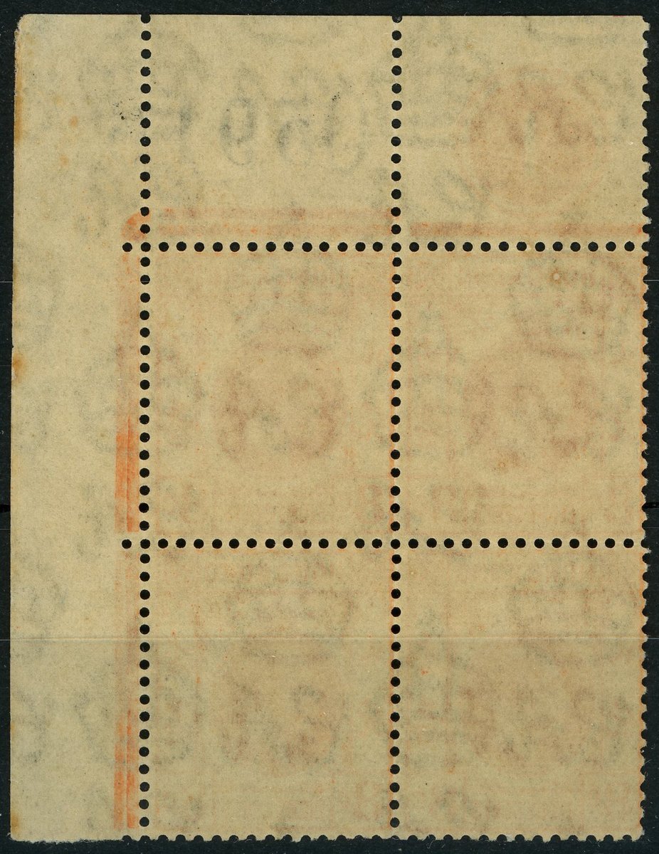 6c. pale orange in a corner plate block of four, sheet number "O5916", unmounted mint; a couple of minor gum bends