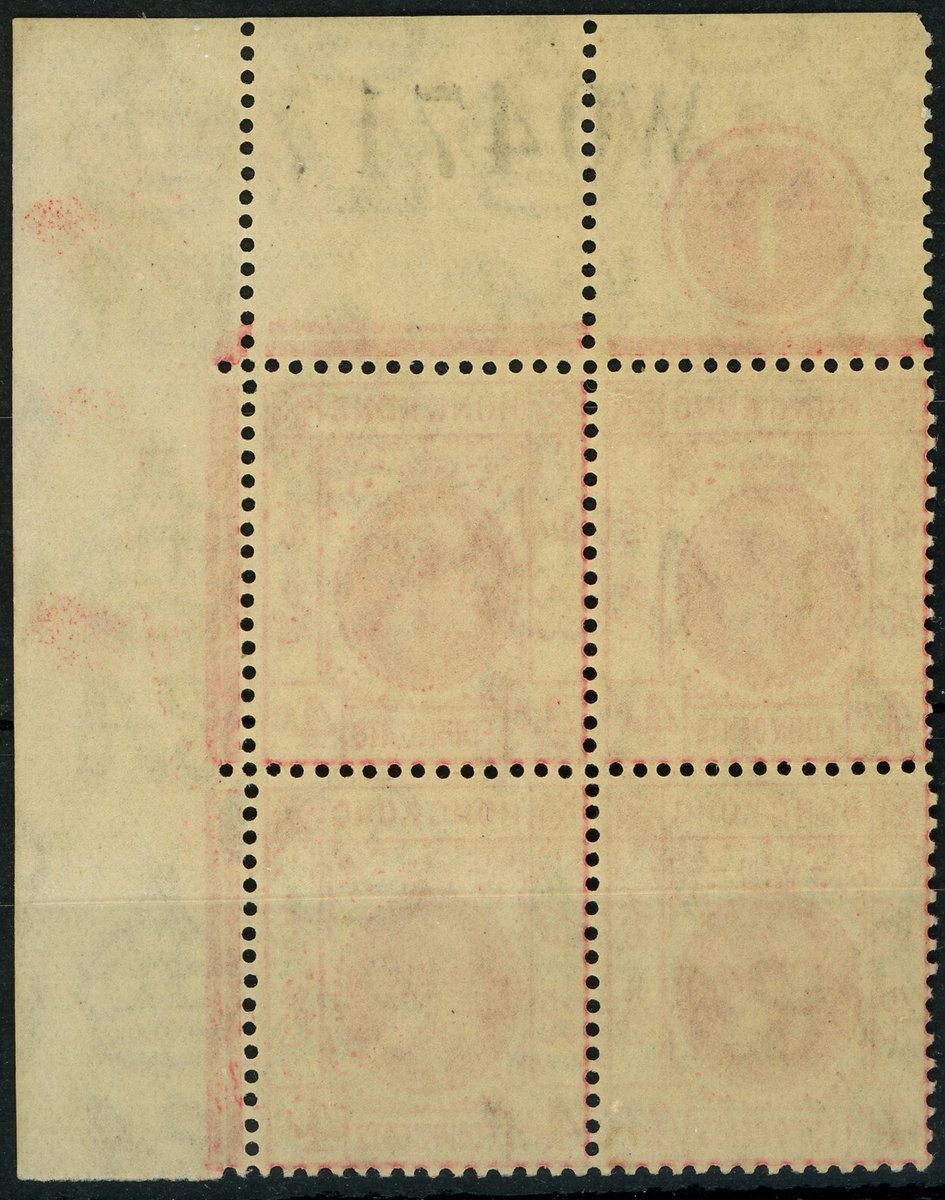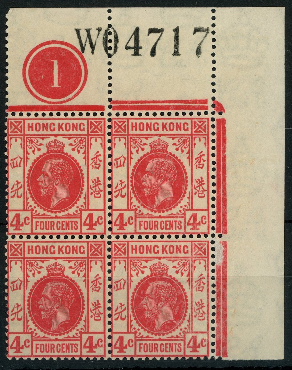 4c. rose-scarlet in a corner plate block of four, sheet number "W04717", unmounted mint; there is a small surface thin in the margin which just affects one of the margin rules