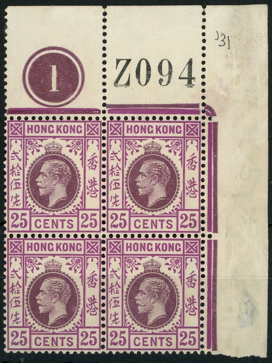 25c. reddish purple and magenta in a corner plate block of four, sheet number "Z094", mounted in the margins only; thin in the side margin and a few split perfs. at top