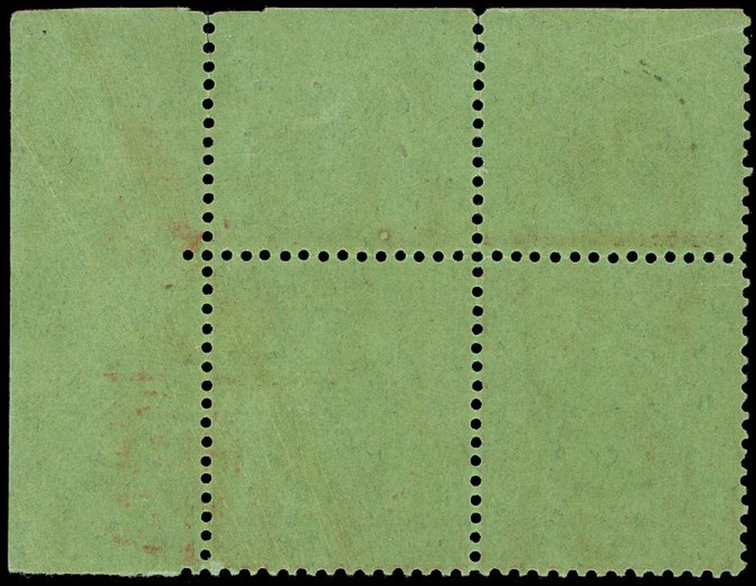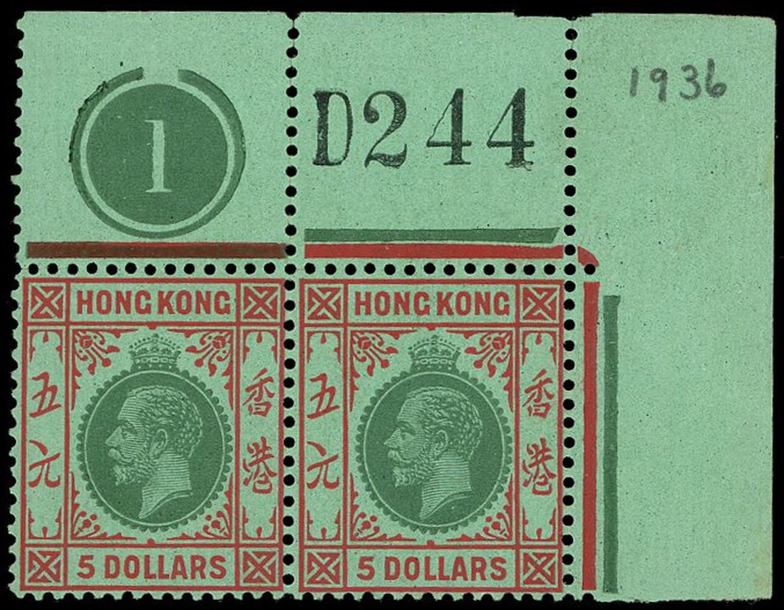 $5 blue-green and red on emerald in a corner plate pair with sheet number "D244", unmounted mint; some split perfs in the top margin. Scarce