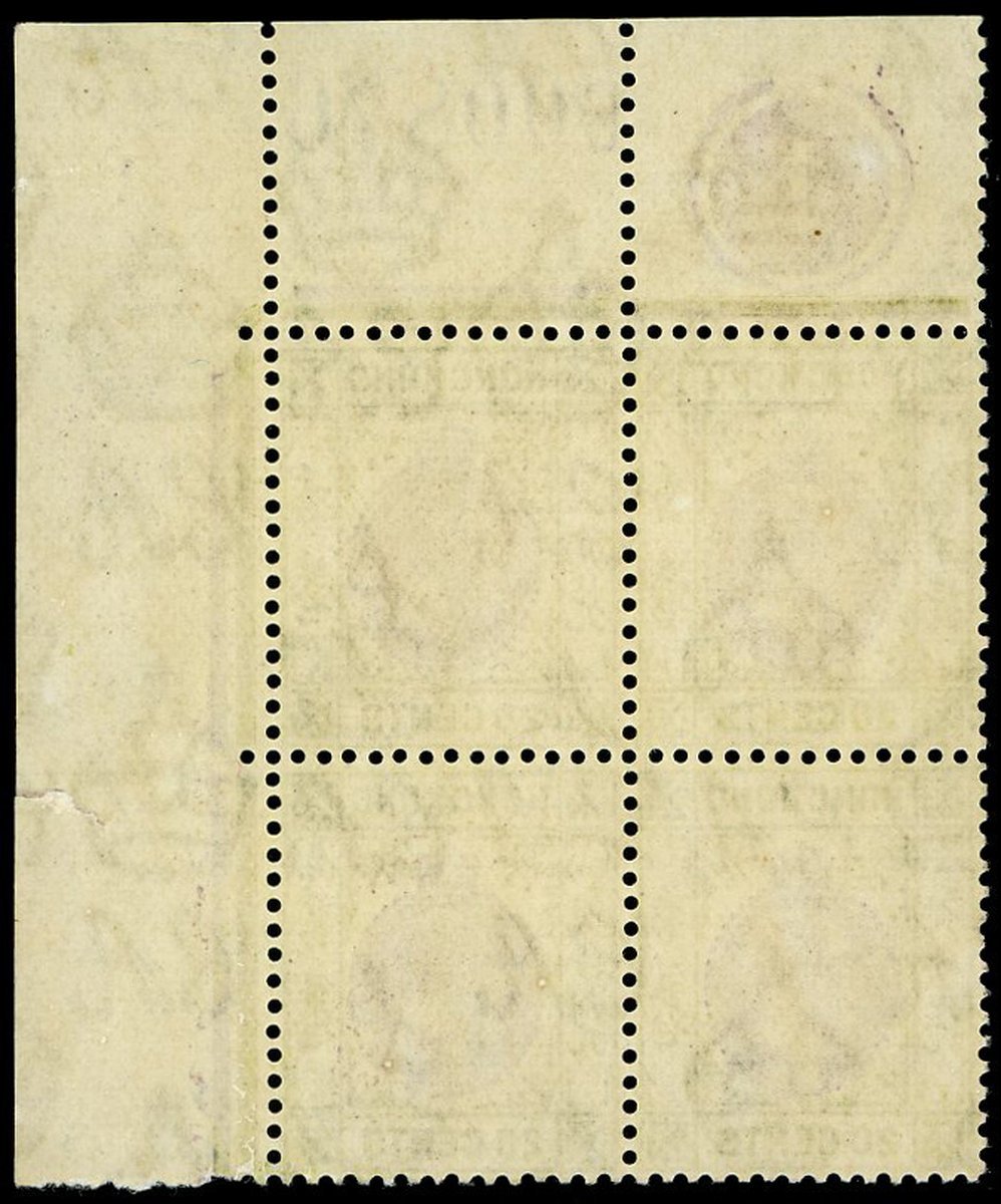 20c. reddish purple and dull yellow-green in a corner plate block of four, sheet number "C00876" unusually in the smaller figures, unmounted mint; small defect in the right margin. A scarce block with the smaller characters