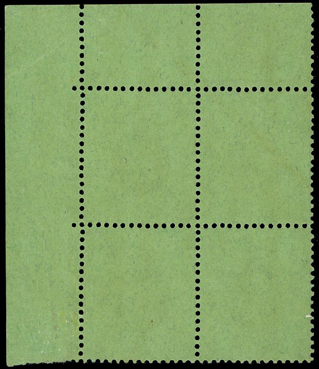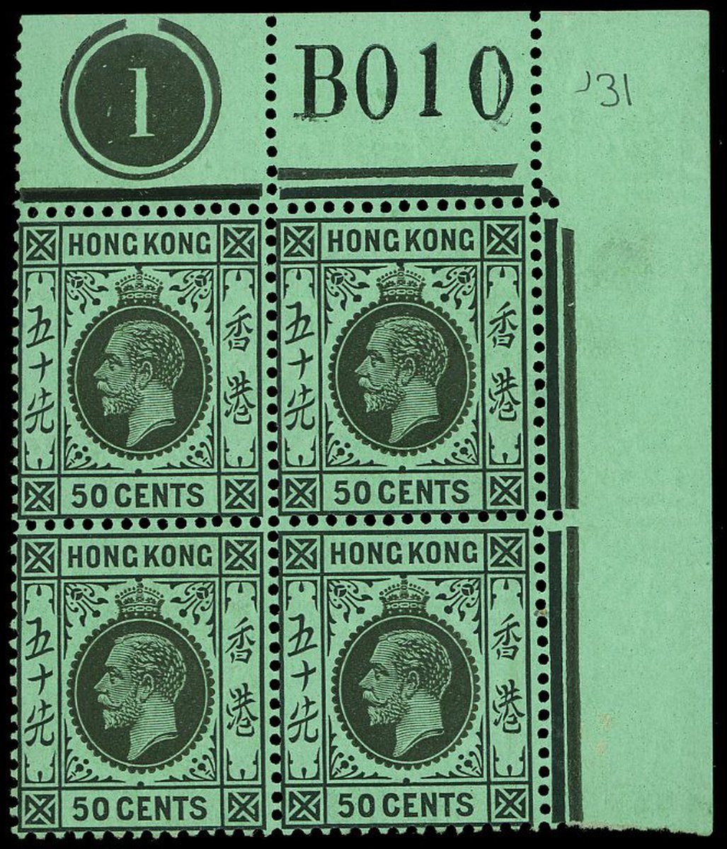 50c. black on emerald in a corner plate block of four, sheet number "B010", unmounted mint