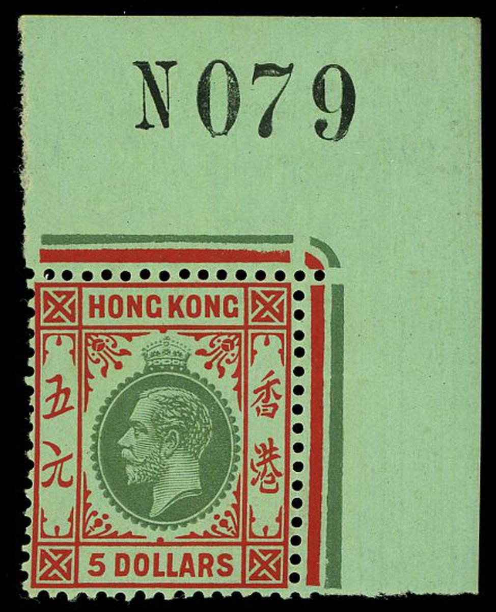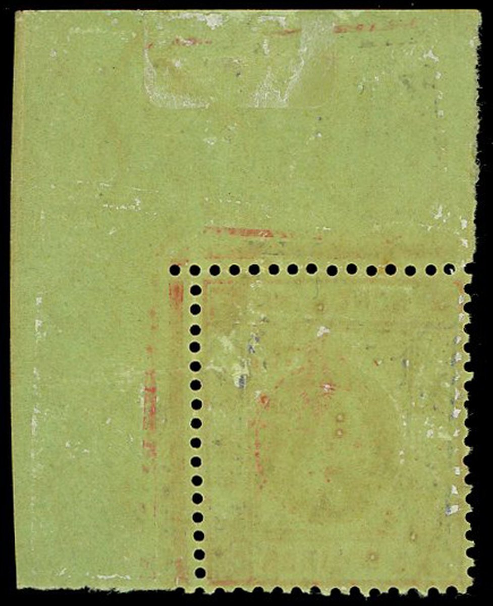 $5 bluish green and carmine-red on emerald, olive back, in a corner single with sheet number "N079", large part original gum; a few adherences on the reverse and a couple of tiny thin spots