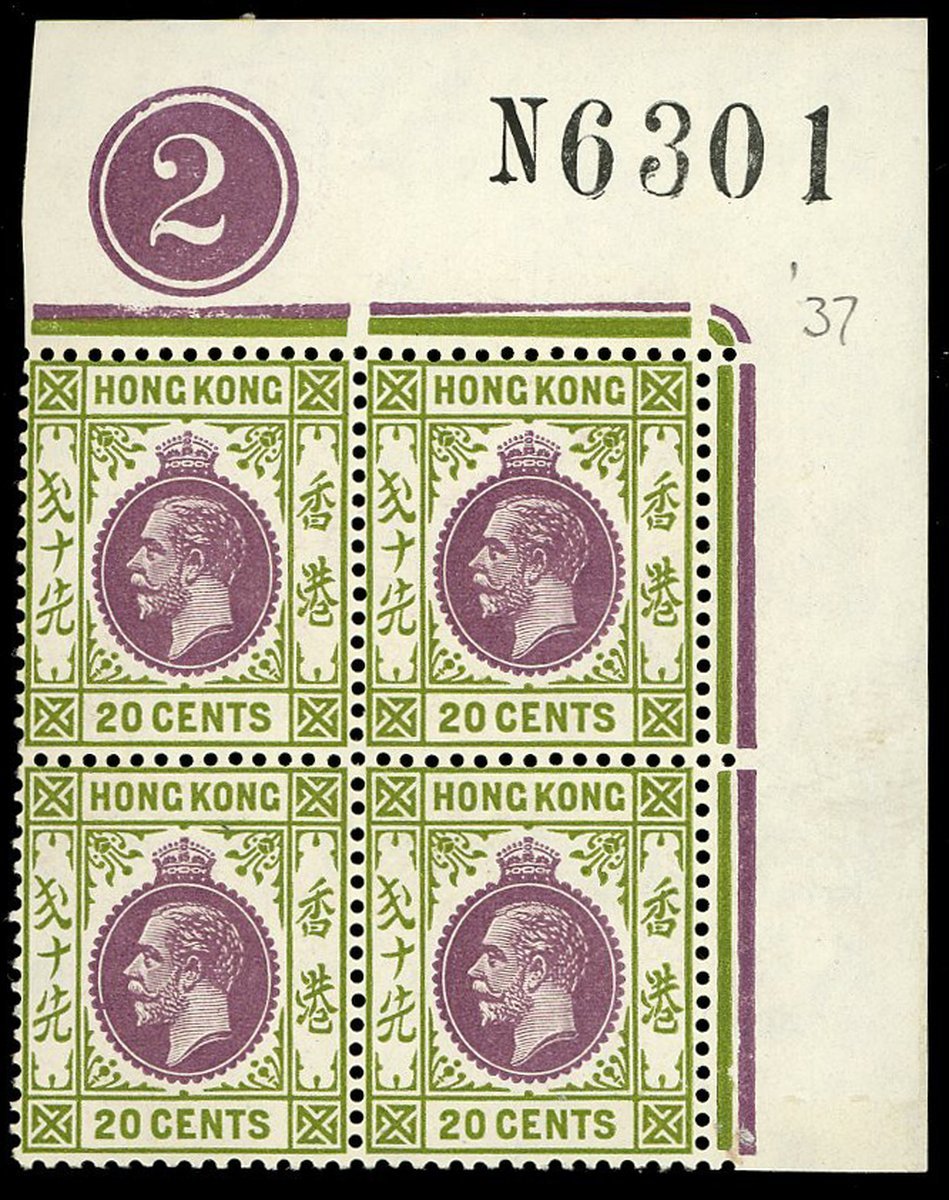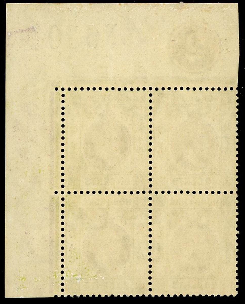 20c. reddish purple and sage-green in a corner plate block of four, sheet number "N6301", unmounted mint. Fine
