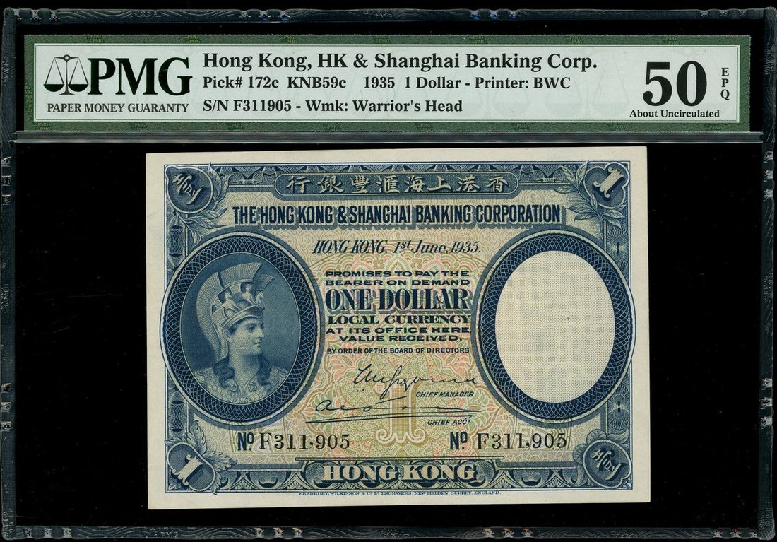 The Hongkong and Shanghai Banking Corporation, $1, 1.6.1935, serial number F311905, (Pick 172c), PMG 50EPQ About Uncirculated