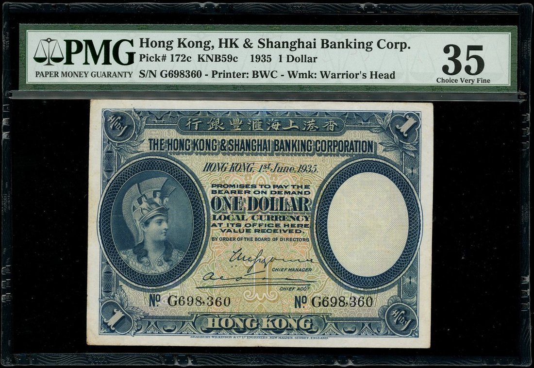The Hongkong and Shanghai Banking Corporation, $1, 1.6.1935, serial number G698360, (Pick 172c), PMG 35 Choice Very Fine