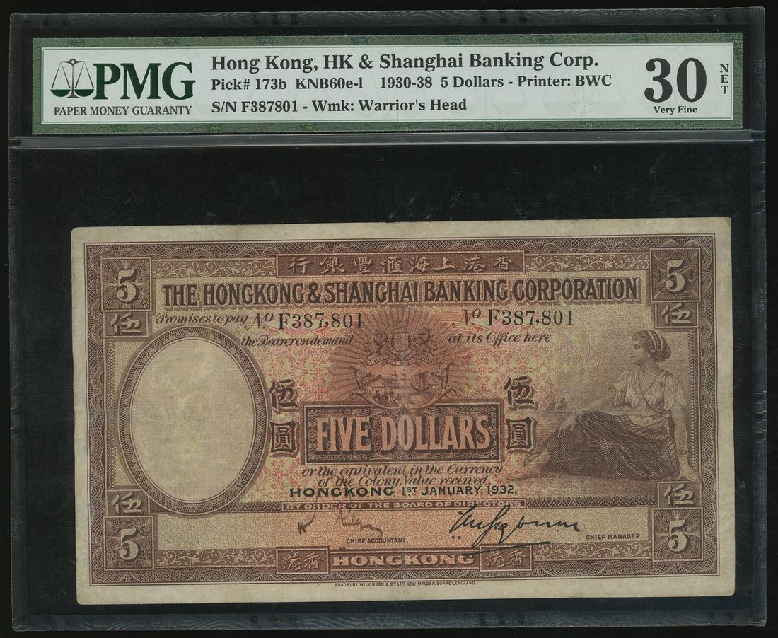 1932年匯豐銀行5元,編號F387801,PMG 30NET,有修補,此系列中罕見年份