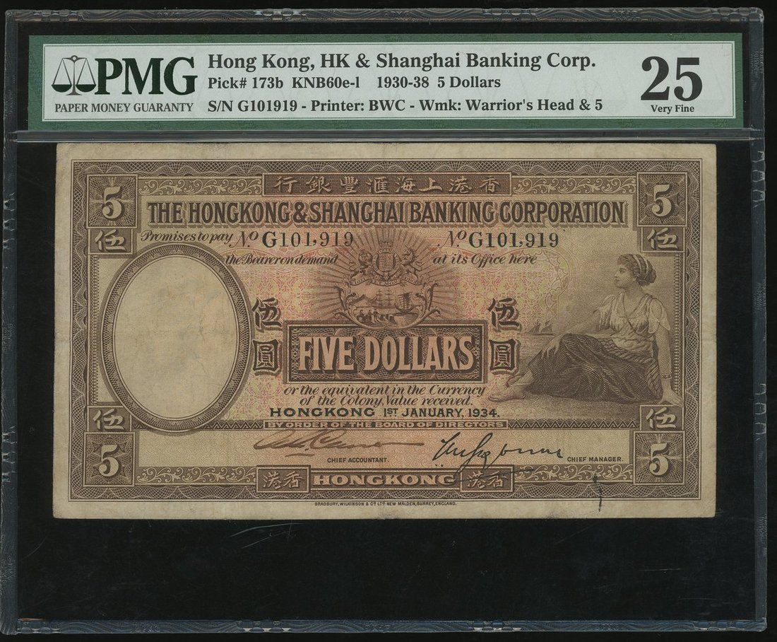 1934年匯豐銀行5元,編號G101919,PMG 25,輕微修補