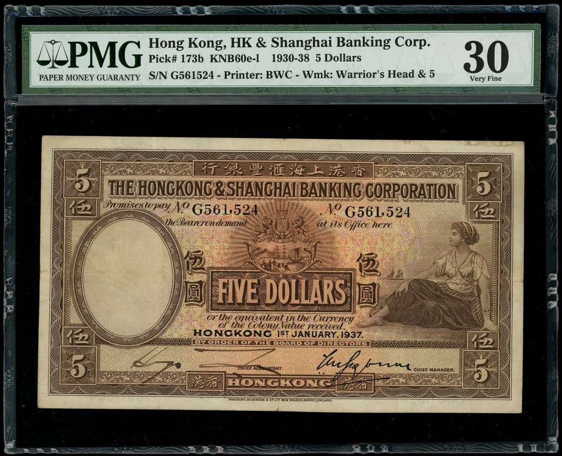 1937年匯豐銀行5元,編號G561524,PMG 30,有墨漬,原裝美品