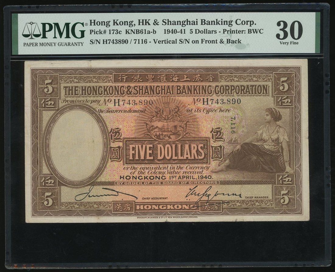 Hong Kong & Shanghai Banking Corporation, $5, 1st April 1940, serial number H743890, with vertical number 7116 on front and back,