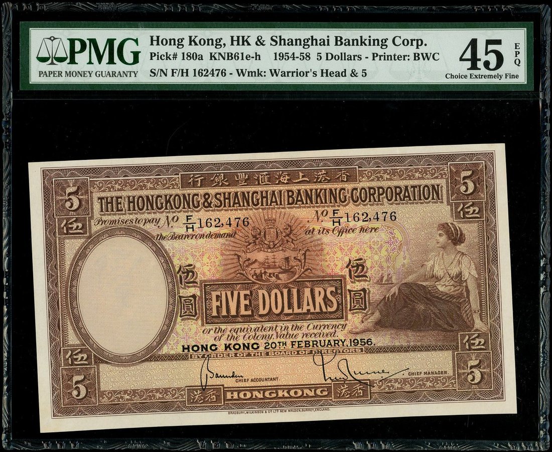 The HongKong and Shanghai Banking Corporation, $5, 20.2.1956, serial number F/H 162476, (Pick 180a), PMG 45EPQ Choice Extremely Fine