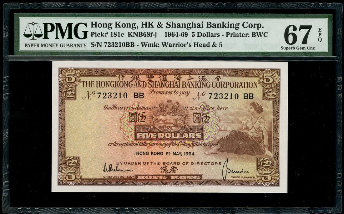 The Hongkong and Shanghai Banking Corporation, $5, 1.5.1964, serial number 723210BB, (Pick 181c), PMG 67EPQ Superb Gem Uncirculated