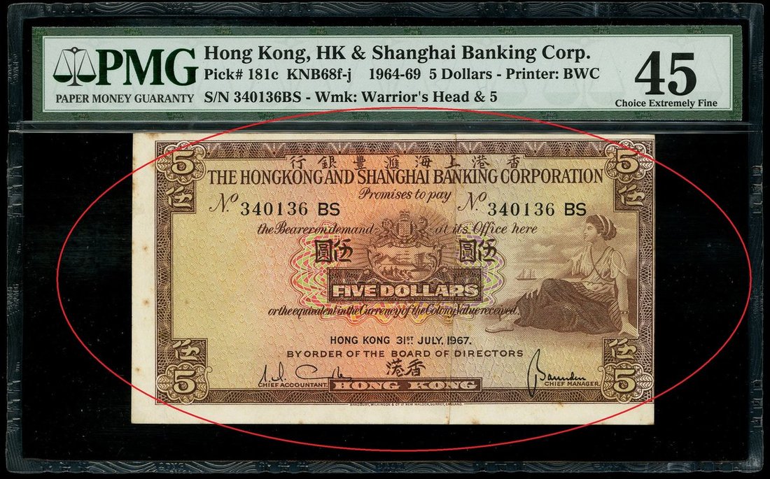 1967年匯豐銀行5元,編號340136 BS,印刷右移錯體,PMG 45,有鏽漬