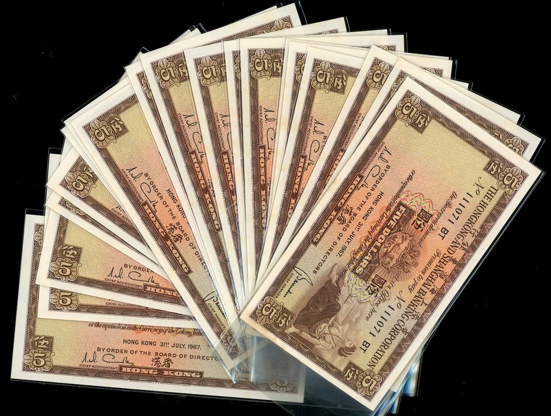 The Hongkong and Shanghai Banking Corporation, $5, 31.7.1967, consecutive run of 20 notes, serial number 111071-90 BT, (Pick 181c), uncirculated with toning spots (20)