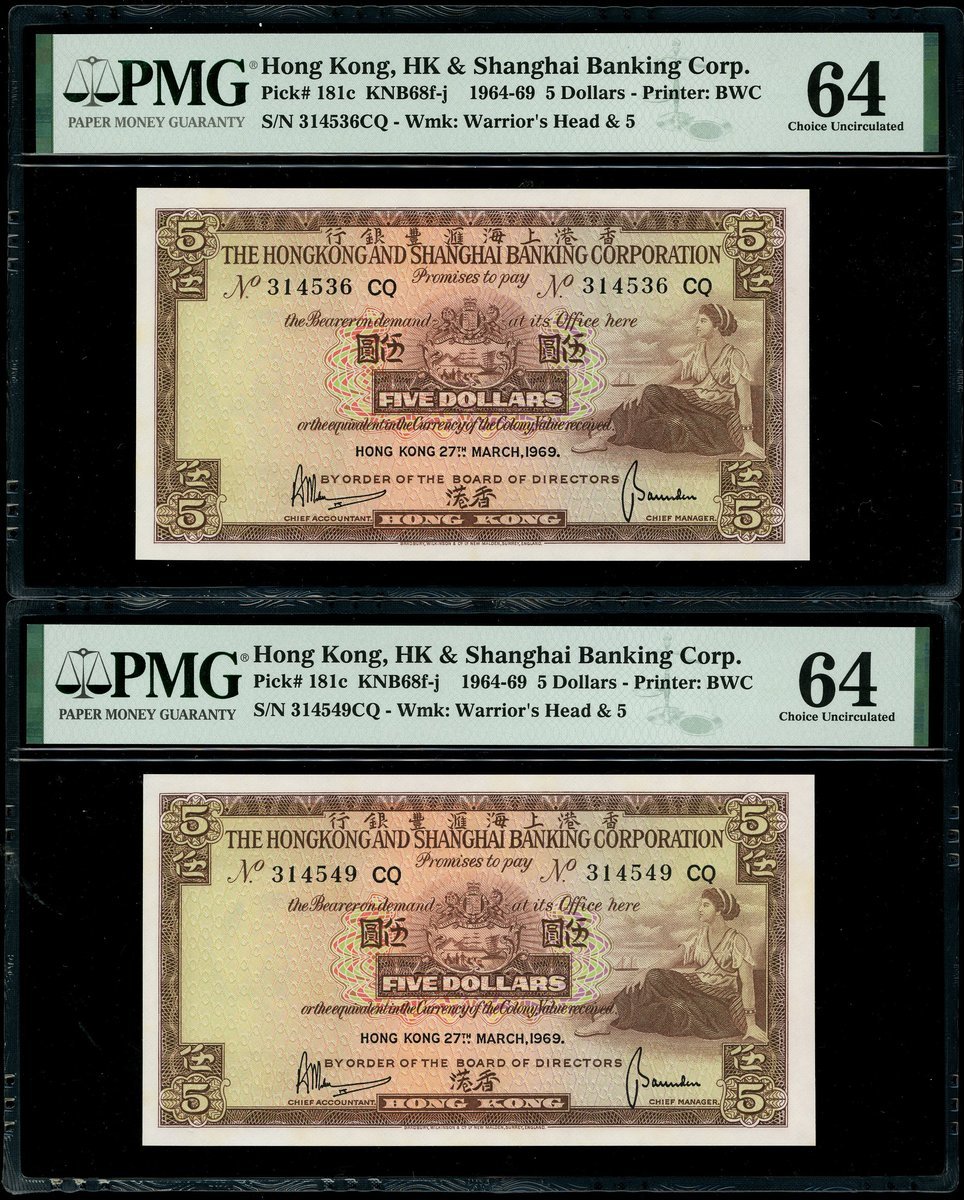 The Hongkong and Shanghai Banking Corporation, a pair of $5, 27.3.1969, serial numbers 314536CQ and 549CQ, (Pick 181c), both graded PMG 64 Choice Uncirculated (2)