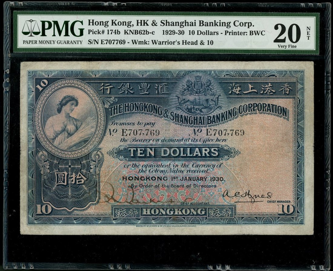 The Hong Kong & Shanghai Banking Corporation, $10, 1.1.1930, serial number E707769, handsigned at lower left,